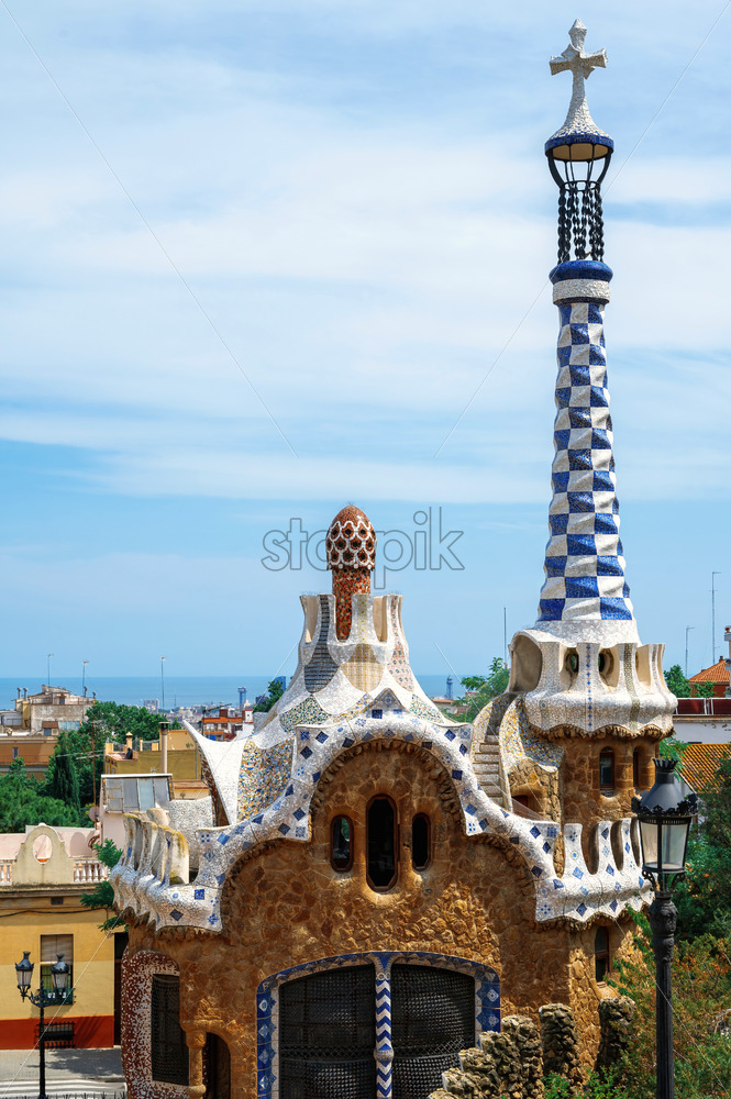 Park Guel, building with unusual architectural style, Barcelona on the background, Spain