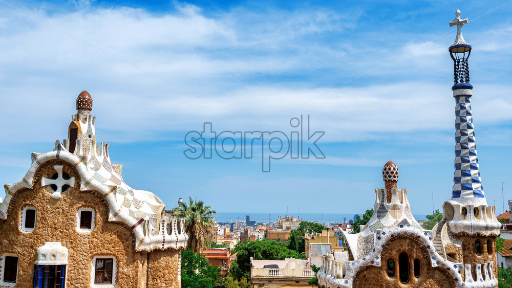 BARCELONA, SPAIN – JUNE 12, 2021: Parc Guel, buildings with unusual architectural style, cityscape on the background