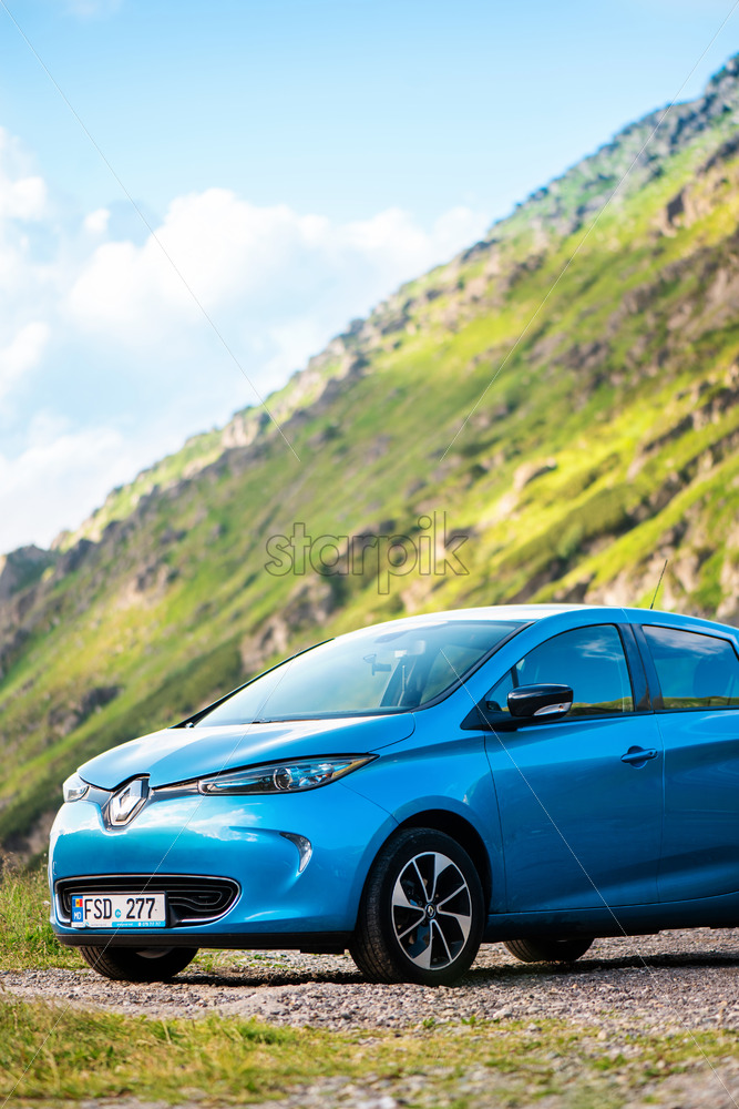 TRANSFAGARAS, ROMANIA – JULY, 2022: Parked electric Renault ZOE at Transfagarasan route. Mountains slopes covered with greenery on the background. Vertical view