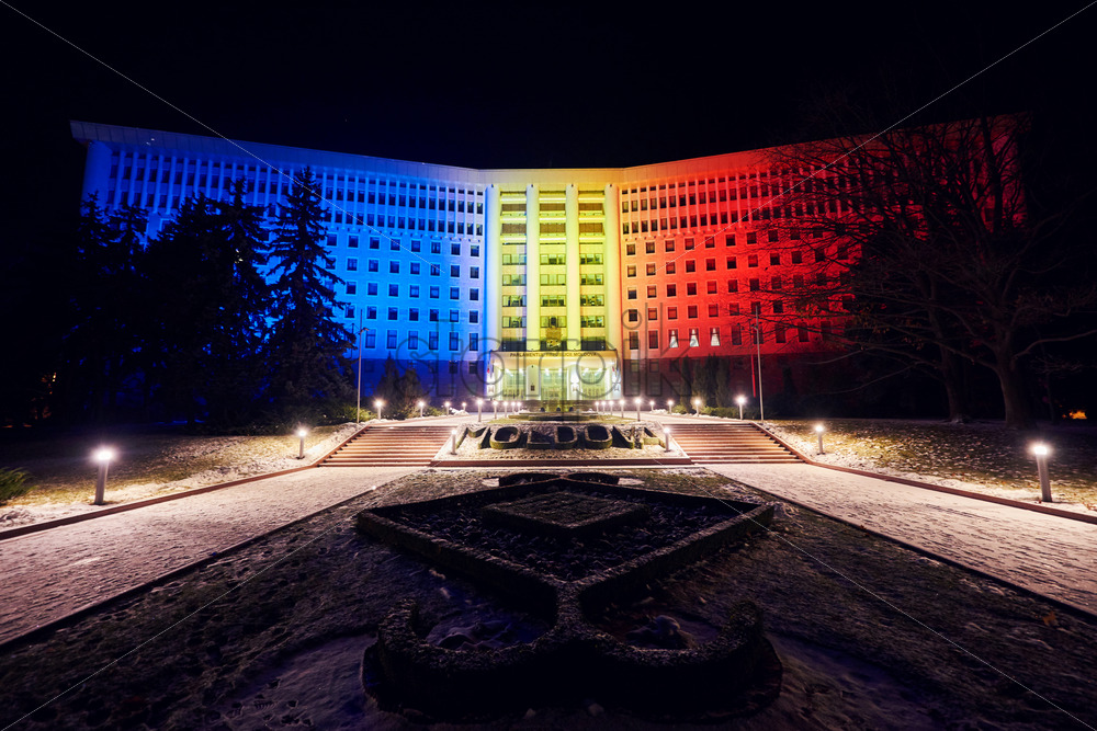 Parliament of Moldova at night with Romanian Flag colors reflecting on building. Chisinau beauties