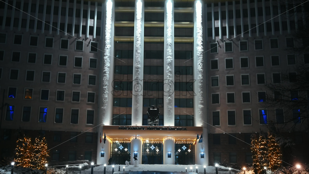 Video – Parliament of the Republic of Moldova with national emblem, illumination and Christmas decorations in the evening. Ground covered in snow. Winter in Chisinau