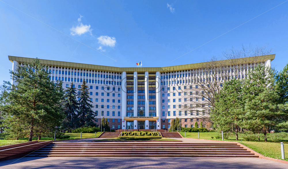 Parliament of the republic of moldova in chisinau, national flag, stefan cel mare street, spring time with blue sky