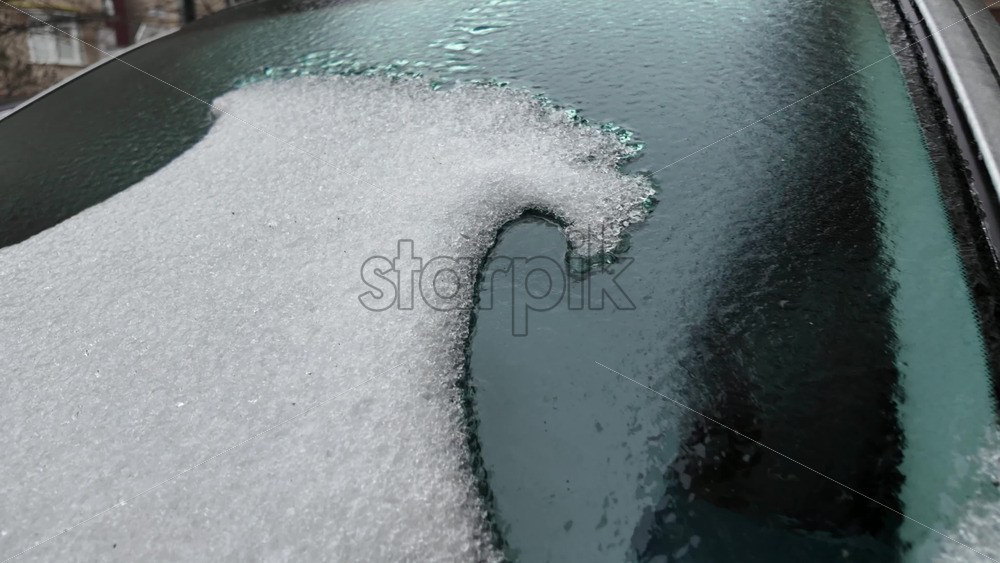Partially melted ice on a car windshield forming an irregular transparent patch