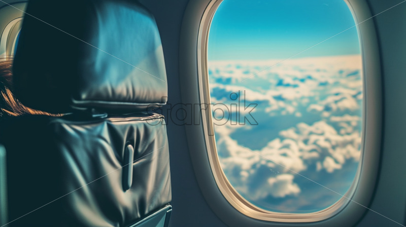 Passenger on an airplane, sitting in an aisle seat and is looking out the window
