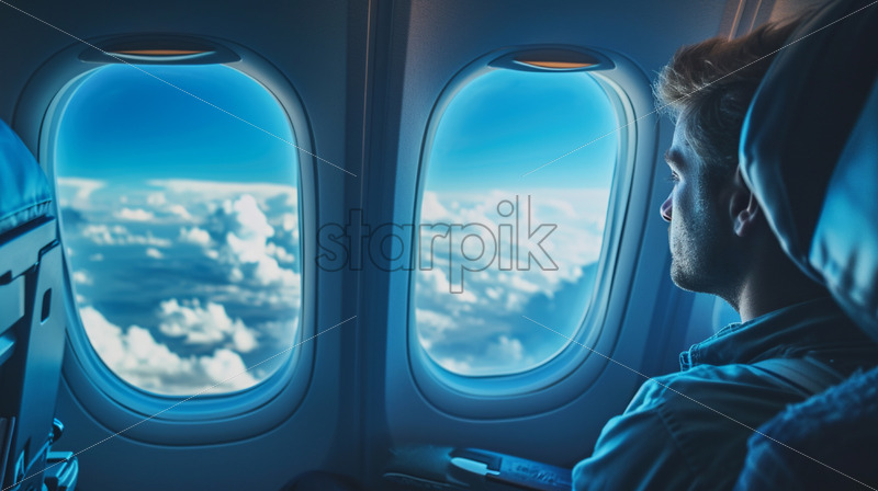 Home » Shop » Uncategorised » Passenger on an airplane, sitting in an aisle seat and is looking out the window