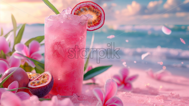 Home » Shop » AI Illustration » Passion fruit drink cocktail on a pink beach with sea view