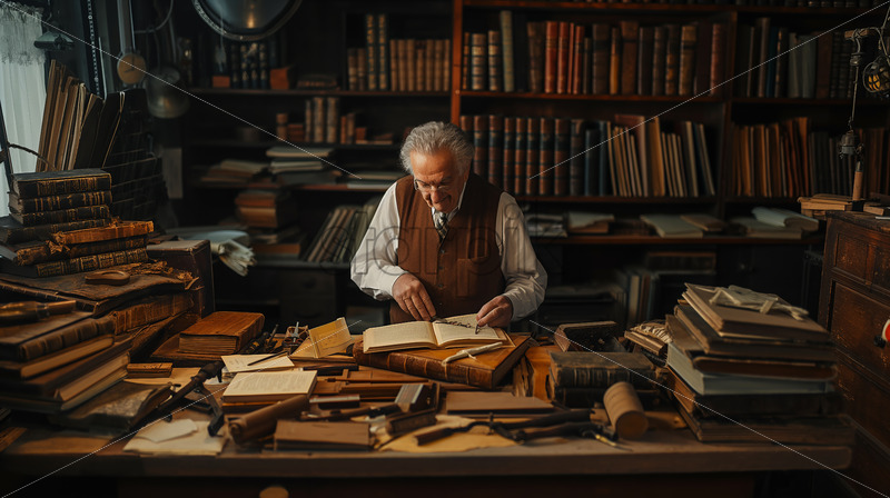 A bookbinder, surrounded by tools and materials, skillfully crafts hand-bound books with meticulous care and attention to detail. Their face is alight with passion for preserving the art of bookmaking.