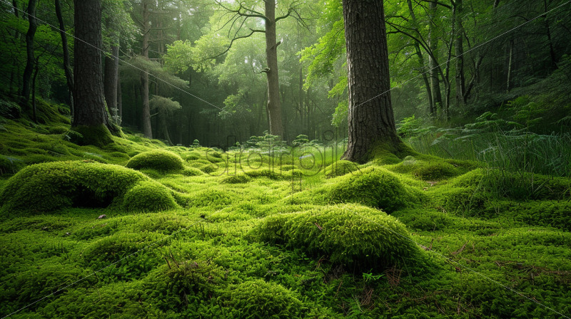 Patches of vibrant moss carpeting the forest floor beneath towering oak trees