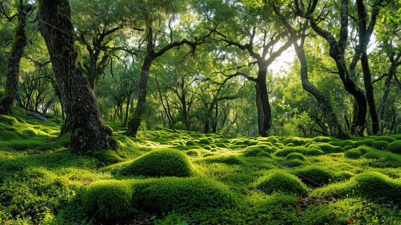 Patches of vibrant moss carpeting the forest floor beneath towering oak trees