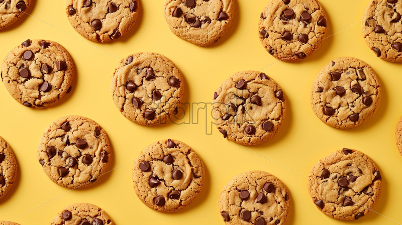 Pattern of chocolate chip cookies scattered on a isolate yellow background