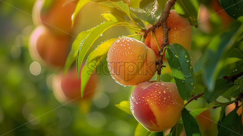 Peaches growing on the tree, close up