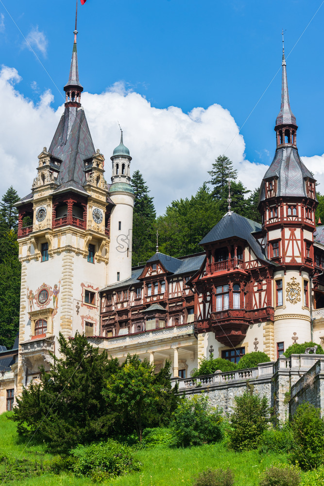 Peles Castle in sunlight in Sinaia. Bottom view. Blue sky with white clouds Royalty Free Stock photo