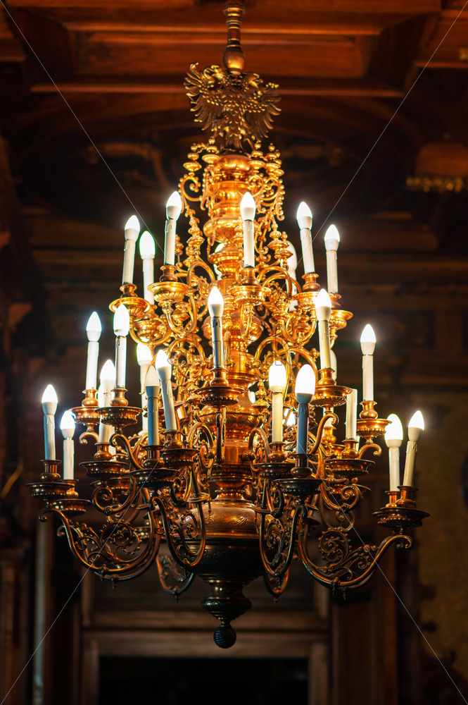 Peles Castle interior in Romania. Close view of a chandelier made in classic style