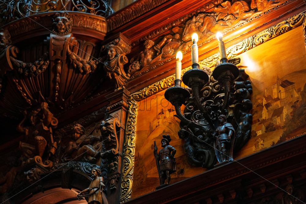 Peles Castle interior in Romania. A room with a classic design and multiple wooden details