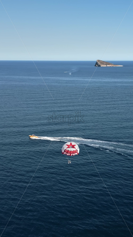 People parasailing on the Mediterranean Sea in Benidorm, Spain. Vertical Royalty Free Stock Video Footage