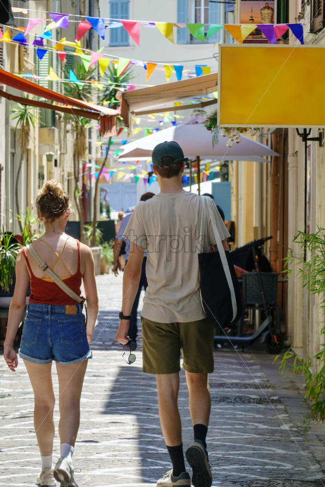 People walking on the street in summer time in Vallauris, France, vertical screen view