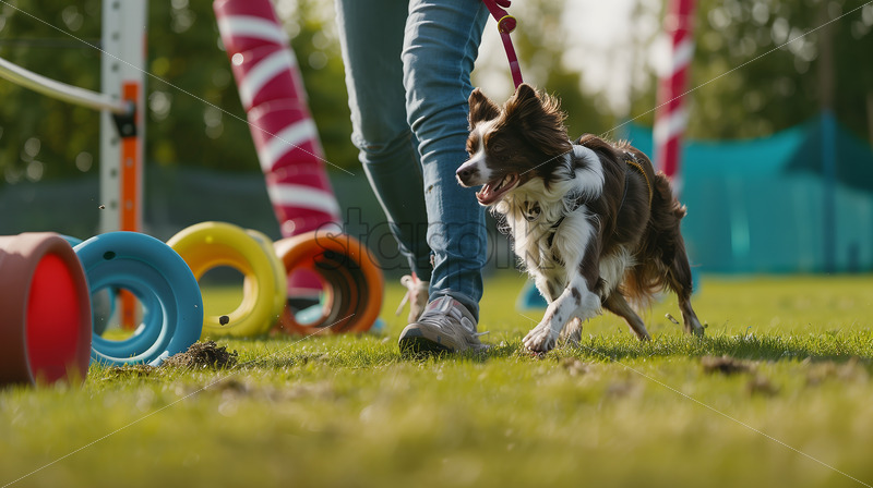 A person guiding a pet through an agility course, capturing the strong bond between owner and furry companion, with agility props in the frame.