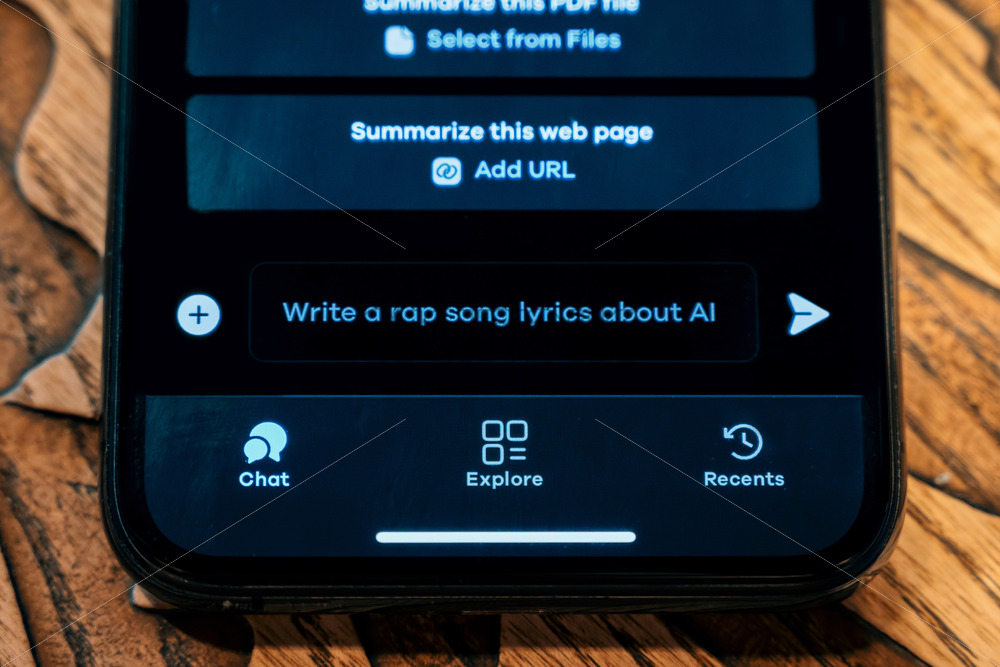 Phone with opened AI chat. Write a rap song about AI request in the dialogue
