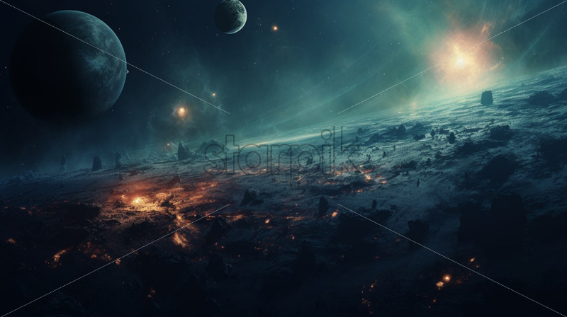 An astronaut floating above Earth, surrounded by planets and galaxies