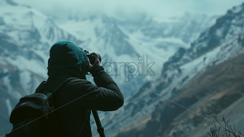 A photographer captures the beauty of a majestic landscape, camera in hand, framed by towering mountains or expansive seascapes. Their face is filled with awe and reverence as they immortalize nature’s grandeur through their lens.