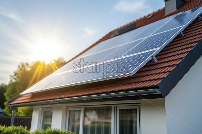 Close view of multiple solar panels on the roof of a manufacturing building. Ecology thematics