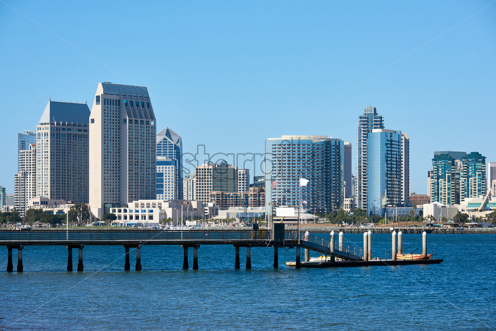 Pier with kayak boats, downtown skyline on background. San Diego, California