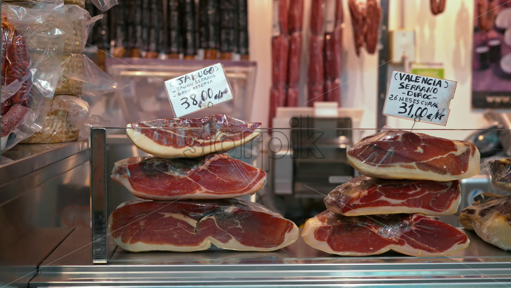 Home » Shop » 1 Video » Video – Piled cuts of jamon behind a glass case with handwritten price signs and hanging sausages at a shop in Valencia, Spain