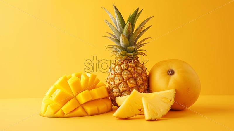 Pineapple and mango slices on yellow background