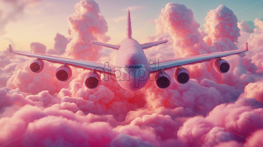 pink airplane flying over pink clouds