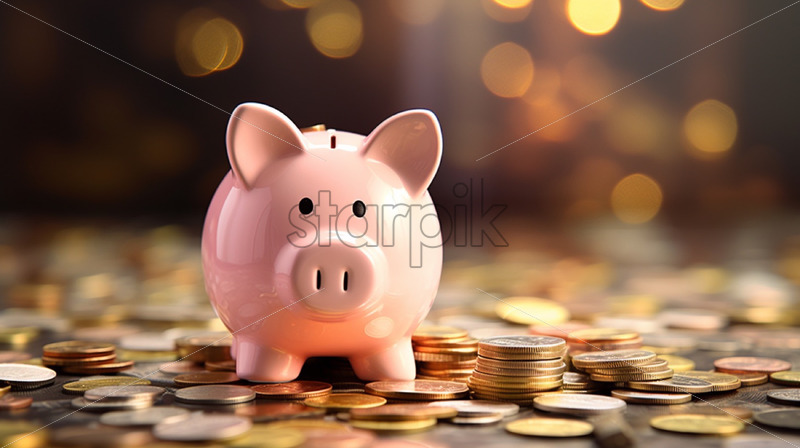 Pink piggy bank with coins money concept
