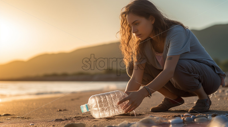 Man at plastic garbage collecting in a polluted park. Rubber gloves, holding a container with plastic bottles. Recycling signs on the T-shirt and container