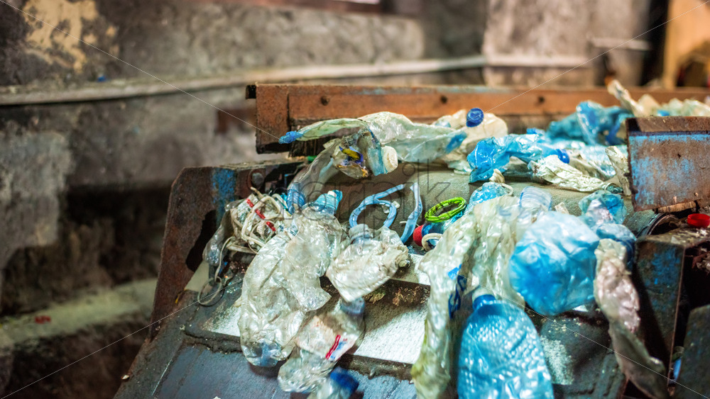 Sorting plastic garbage on a vibrating conveyor belt at waste recycling factory. Slow motion