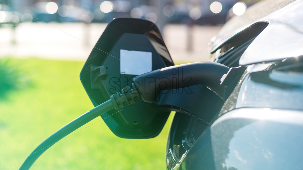 Home » Shop » photo » Plugged in charger into an electric car at charge station