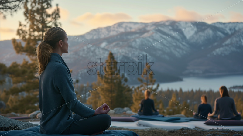 A poised mindfulness instructor guiding a class amid the majestic mountains of Lake Tahoe, California.