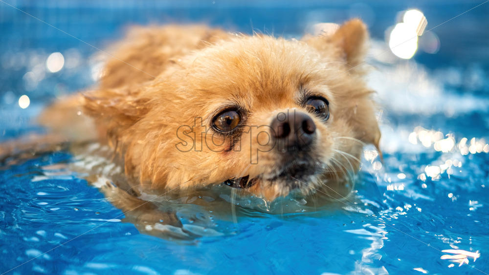 Pomeranian with yellow fur lying in the snow on the backyard. Snowflakes falling on it Royalty Free Stock Video Footage
