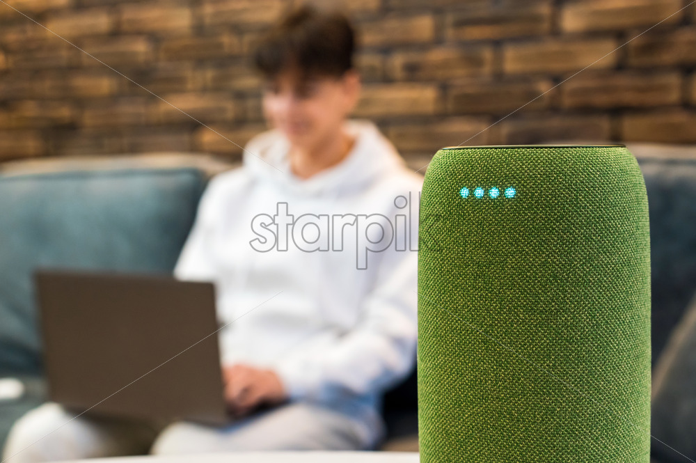 Portable wireless speaker with 4 luminous diodes. A guy with laptop on the background