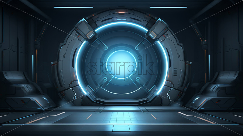 Young girl using virtual reality helmet while wearing a jacket. Neon red and blue lights on concrete background. Holding hand, stop sign. Place for text Royalty Free Stock photo