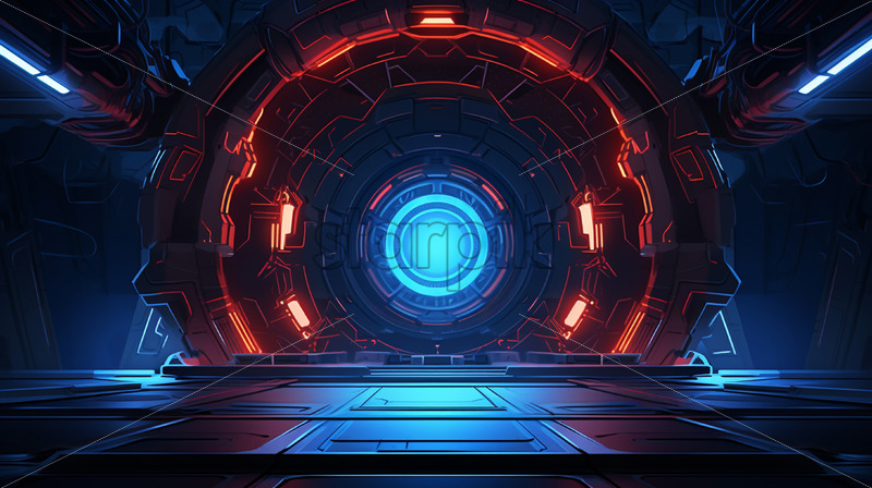 Young girl holding virtual reality helmet while wearing a jacket. Neon red and blue lights on concrete background. Place for text Royalty Free Stock photo