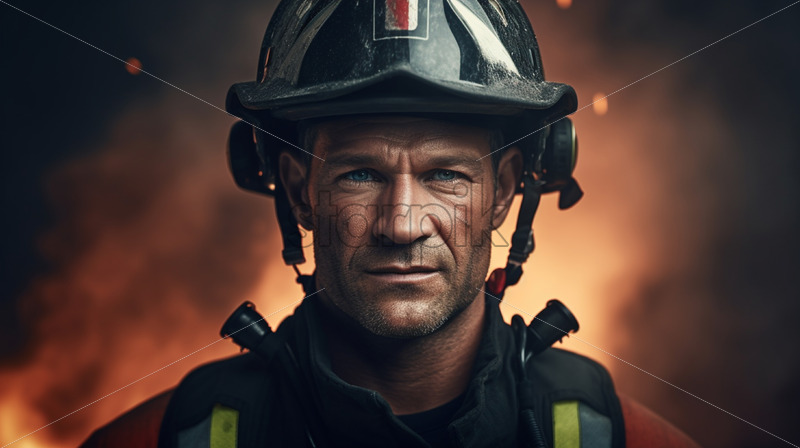 A brave firefighter in a wildfire setting, standing near a specialized firefighting vehicle, with flames and smoke in the background.