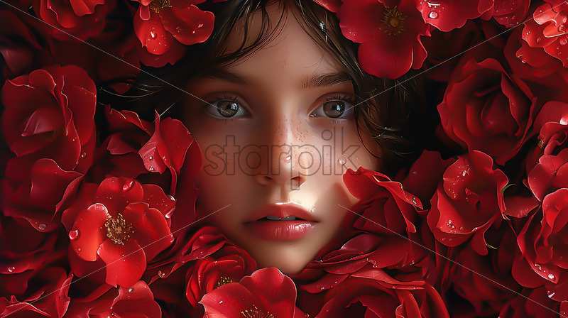 Portrait of a girl on the background of red flowers