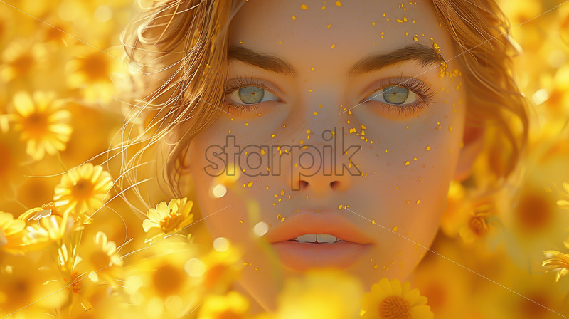 Portrait of a girl on the background of yellow flowers