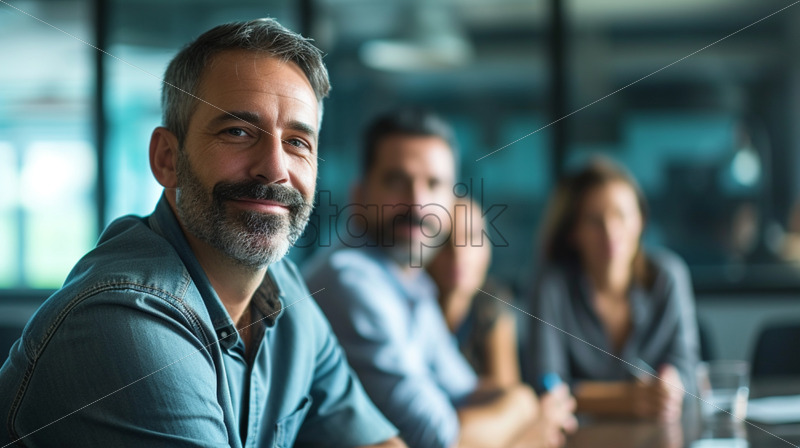 Two caucasian mature women and a man discussing ideas on stickers in the office. View through window Royalty Free Stock photo