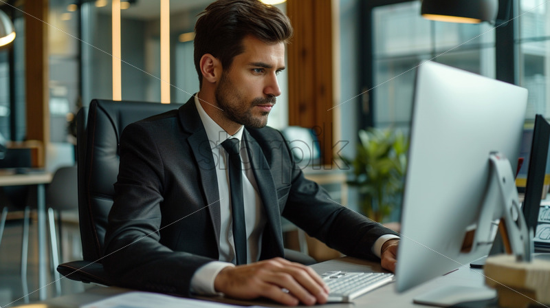 Portrait of a man in a suit typing on a computer at a tidy desk