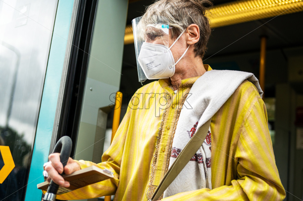 FRANKFURT, GERMANY – SEPTEMBER, 2022: Portrait of a man in a medical mask and visor