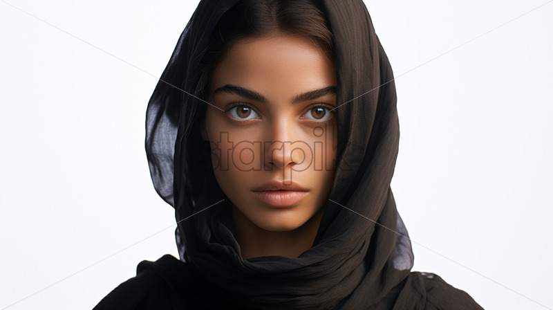 Close-up shot of a young caucasian girl with curly long dark brown hair and bangs. Freckles on the face. Expressing tenderness. Isolated background