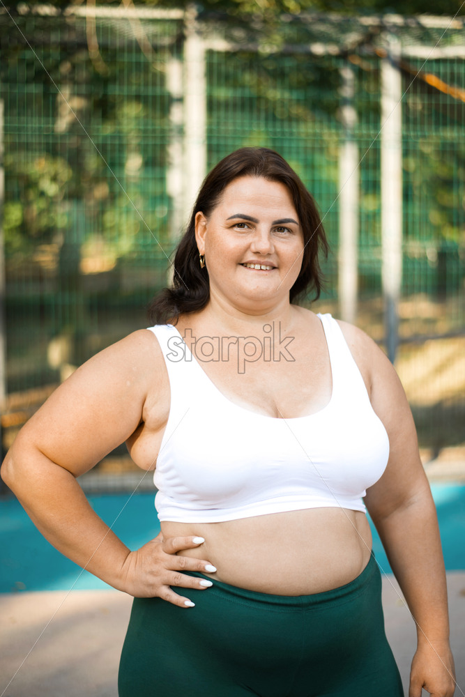 Home » Shop » photo » Portrait of a smiling woman with overweight in a tracksuit on a sports field in a park looking into the camera