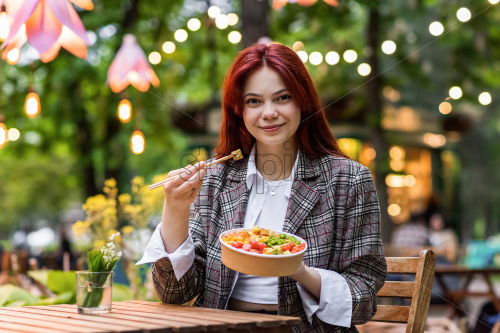 Home » Shop » photo » Portrait of a smiling young woman eating poke bowl with vegetables and fruits, holding a bean with chopsticks. Park with a lot of greenery and illumination