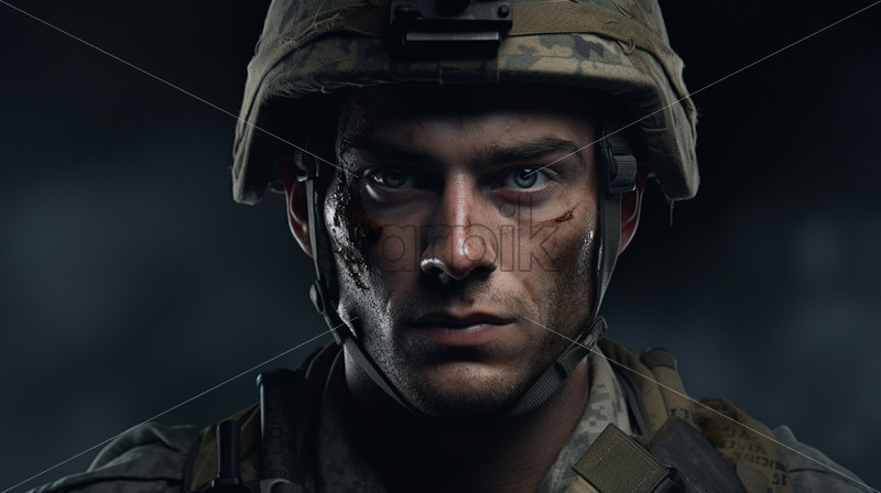 Crying man with tragic look and national flags of Ukraine on his cheeks, black background