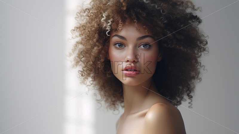 Portrait of a young woman with curly hair and blue eyes in black medical mask with water on the background