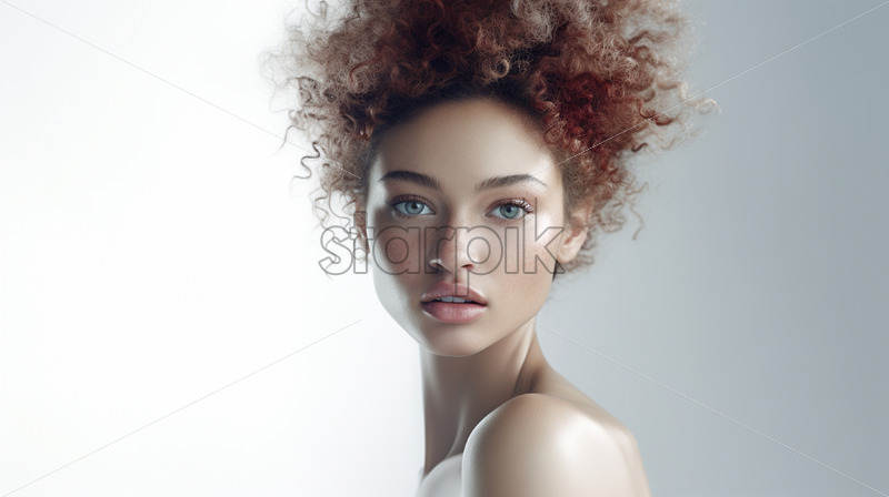 Portrait of a young woman with curly hair and blue eyes in black medical mask with water on the background